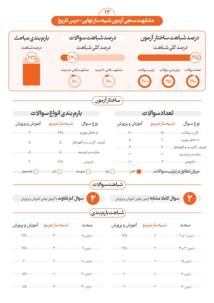 تحلیلهای انجامشده بر اساس تصویر رسمی مقایسه، بهوضوح نشان میدهد که آزمون اردیبهشت نمرینو در درس تاریخ پایه دوازدهم، با شباهت بسیار زیاد به آزمون نهایی خرداد تاریخ طراحی شده است. این آزمون با: