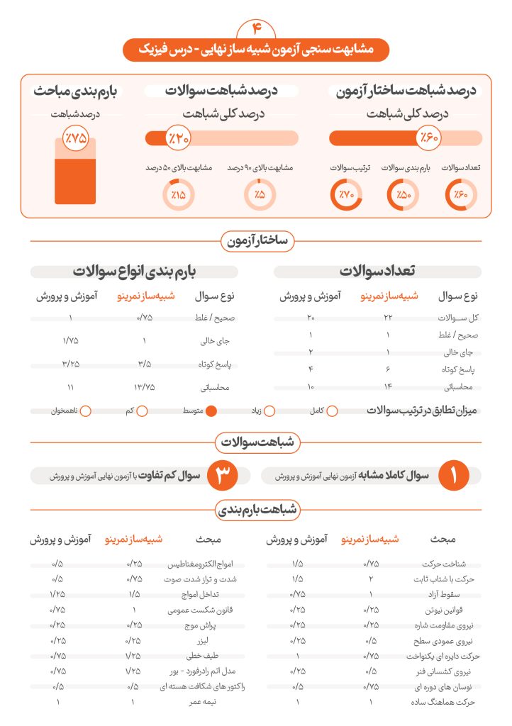 در مجموع، میتوان گفت ۶۰ درصد شباهت ساختاری کلی بین آزمون نمرینو و نهایی فیزیک 3 وجود دارد، که عدد قابل قبولی برای یک آزمون تمرینی استاندارد به حساب میآید.