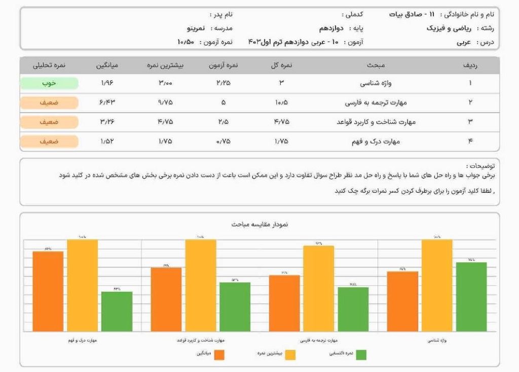 🔹 تحلیل: نیاز به تمرین ترجمهی جملات و درک ساختار جملههای عربی دارد. پیشنهاد میشود روزانه چند جمله از کتاب درسی ترجمه و با پاسخ صحیح مقایسه شود. - مهارت شناخت و کاربرد قواعد: