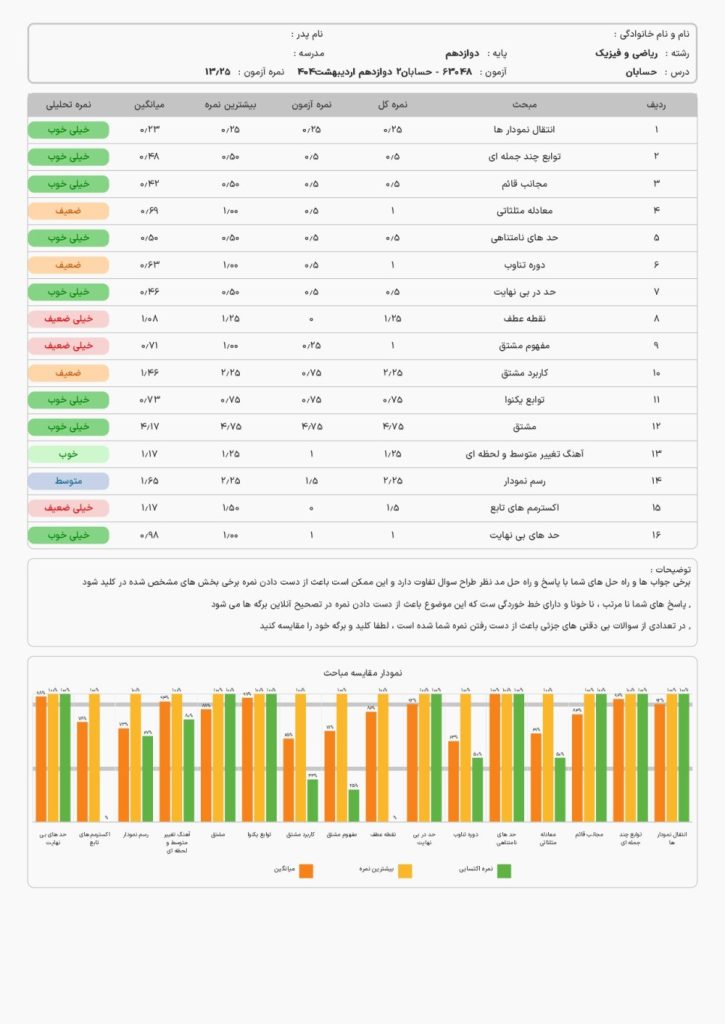 گزارش دانشآموز نشان میدهد که نمره کل در آزمون 63048 (حسابان 2، پایه دوازدهم) 13.25 از 20 به دست آمده است. نقاط قوت شامل عملکرد بسیار خوب در مباحثی مثل انتقال نمودارها، توابع چندجملهای، مجانب قائم، حدهای نامتناهی، حد در یکنهایت، توابع یکنواخت، مشتق، و حدهای یکنهایت است که در همه اینها نمره کامل یا نزدیک به کامل کسب شده است. نقاط ضعف شامل عملکرد ضعیف تا بسیار ضعیف در مباحثی مثل معادلات مثلثاتی، دو جمله تناوب، نقطه عطف، مفهوم مشتق، کاربرد مشتق، اکسترممها، و آهنگ تغییر متوسط و لحظهای است، بهویژه جایی که نمرات صفر یا پایینتر از میانگین کلاس دریافت شده است.