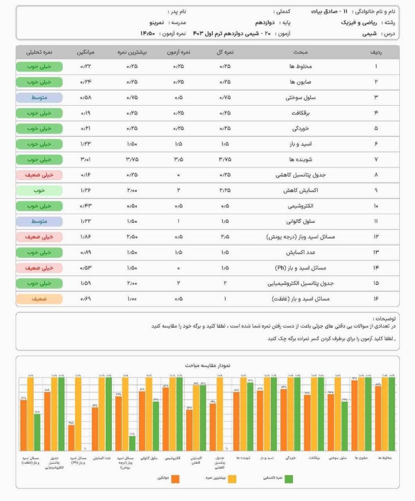 نمودار پایین صفحه، مقایسه‌ای بین درصد نمره شما (ستون نارنجی) و میانگین کل دانش‌آموزان (ستون سبز) را نشان می‌دهد.
