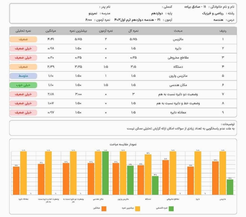| مکان هندسی | 1.10 | خیلی خوب | تسلط بالا در این مبحث؛ نقطه قوت اصلی دانشآموز. |
